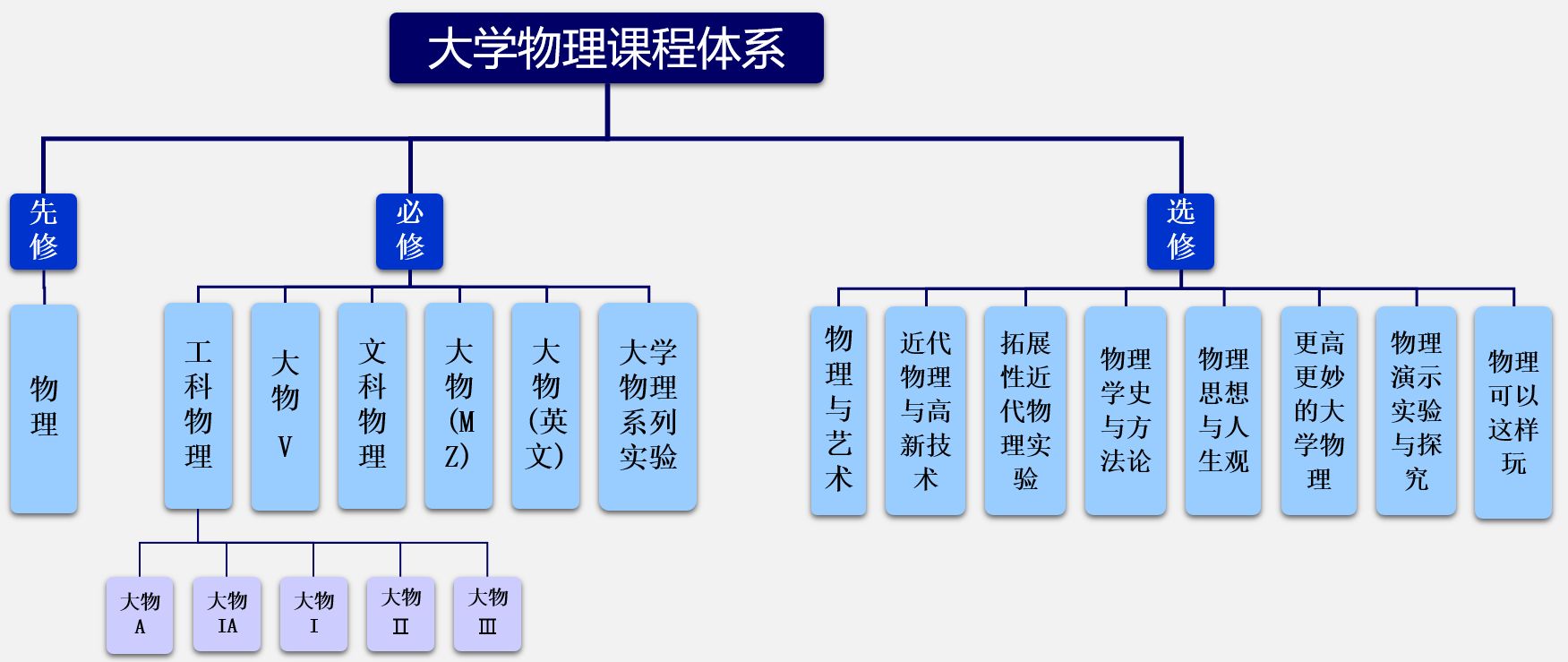 大学物理教学与研究中心的前身可追溯到建校初期的基础部物理教研室,在老一辈教师的带领下,形成了严谨治学、精心从教、勇于创新的高尚师德风范,对今后物理学科和大学物理教学的发展奠定了重要基础;此后在施大宁教授等教师的带领下,团队贯彻通识教育理念,建构多维学习情境,对 “大学物理”课程进行了全方位的改革和建设。目前亚洲色吧 大学物理课程由先修、必修和后续选修课组成,形成了以物理教育为基础,培养科学与人文素质、提高创新能力为特色的较为完备的课程体系(图1)。