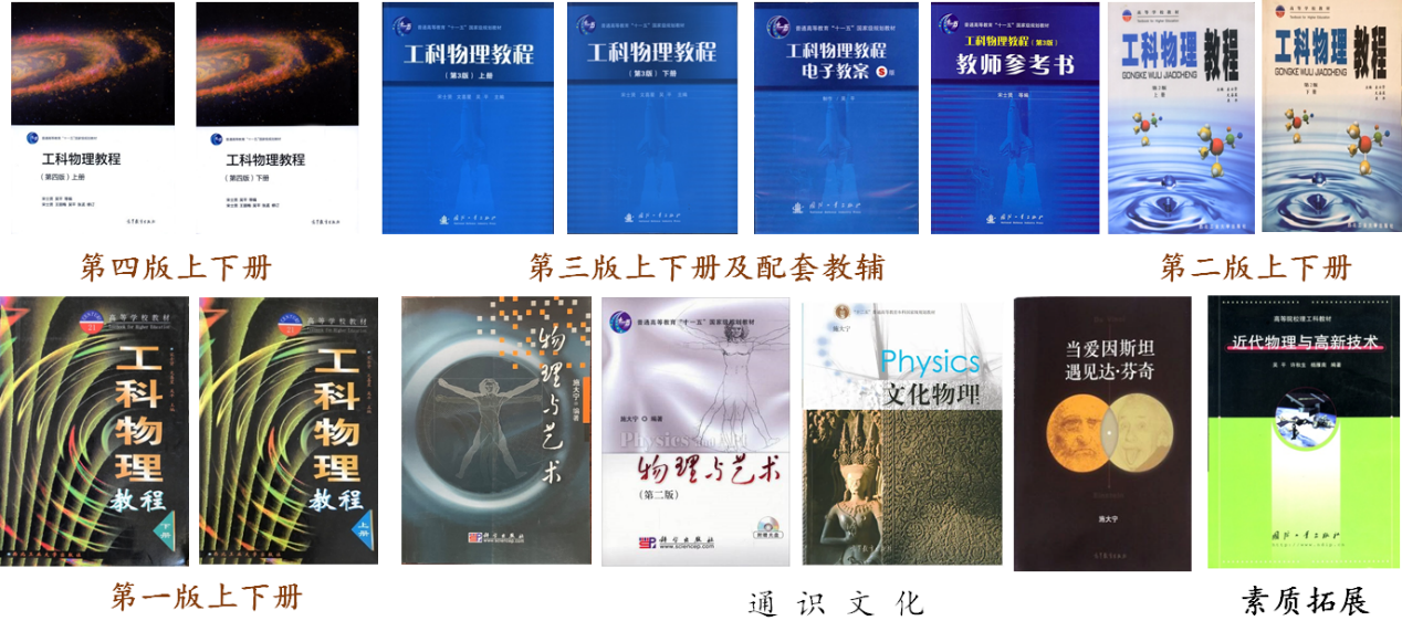 通过几代人的努力,中心取得丰富的建设成果。大学物理课程被评为江苏省精品课程;在课程建设的同时,团队也重视配套教材的建设(图2)。《工科物理教程》在如何加强物理基础、凸显教材的时代气息和工科物理特色、习题作业改革、增强教材的趣味性等方面皆作了一些大胆的探索和尝试;《物理与艺术》等教材更是开创了国内物理类素质教育先河,在全国有很强的示范引领作用。另外,我们格外重视基层教学组织建设,2010年大学物理教学团队被评为江苏省优秀教学团队。系列工作得到广泛认可,2011年获江苏省教学成果特等奖,《拓展内涵 融合创新 构建工科院校大学物理系列课程体系》荣获2014年国家级教学成果一等奖(图3)。在这个过程中涌现出国家级教学名师施大宁教授,江苏省教学名师杨雁南教授等先进人物。