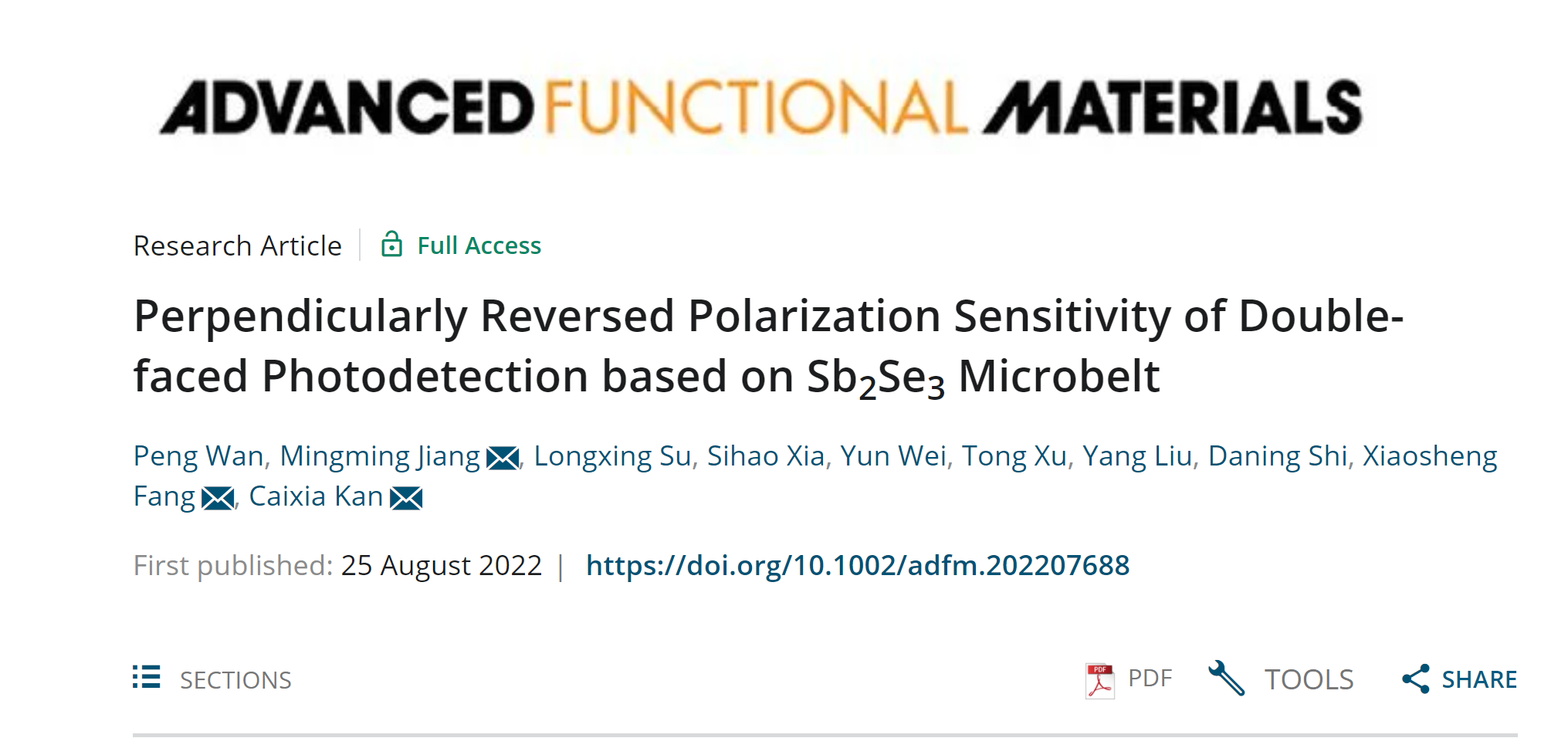 针对上述问题,亚洲色吧 阚彩侠教授团队与复旦大学方晓生教授、南方科技大学苏龙兴教授合作,通过化学气相沉积法生长出高结晶质量的硒化锑(Sb2Se3)微米带,并成功实现了基于Sb2Se3微米带的双面偏振探测器。Sb2Se3微米带的偏振探测器从宽的辐照面到窄的辐照面,偏振敏感性出现了明显的垂直反转。相关研究成果以“Perpendicularly Reversed Polarization Sensitivity of Double-faced Photodetection based on Sb2Se3 Microbelt”为题于2022年8月25日发表在Advanced Functional Materials上。