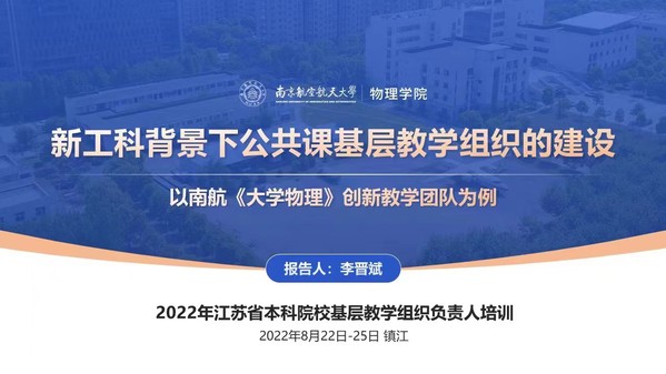8月22日至24日,江苏省本科院校基层教学组织负责人培训(文科专业和公共基础课教师)在江苏大学成功举办。亚洲色吧 李晋斌教授就“新工科背景下公共课基层教学组织的建设作了专题报告,系统介绍了亚洲色吧 大学物理基层教学组织的相关建设经验,获得了到会专家和学员热烈反响。