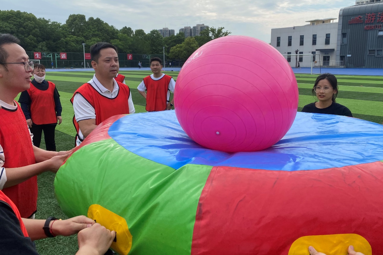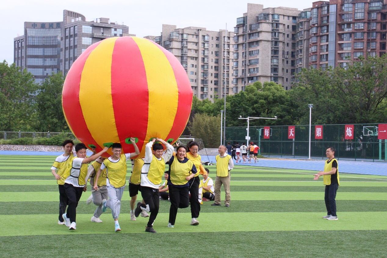 在“厚德载物 运转乾坤”项目中,四支代表队的选手们各自8名队员分工合作,努力配合,在听到哨声的一刹,合理扛着“乾坤球”在跑道上冲刺接力。在烈日照耀下,大家不畏艰辛,都在努力为团队争夺分数,越过终点线时的喜悦洋溢于脸上。