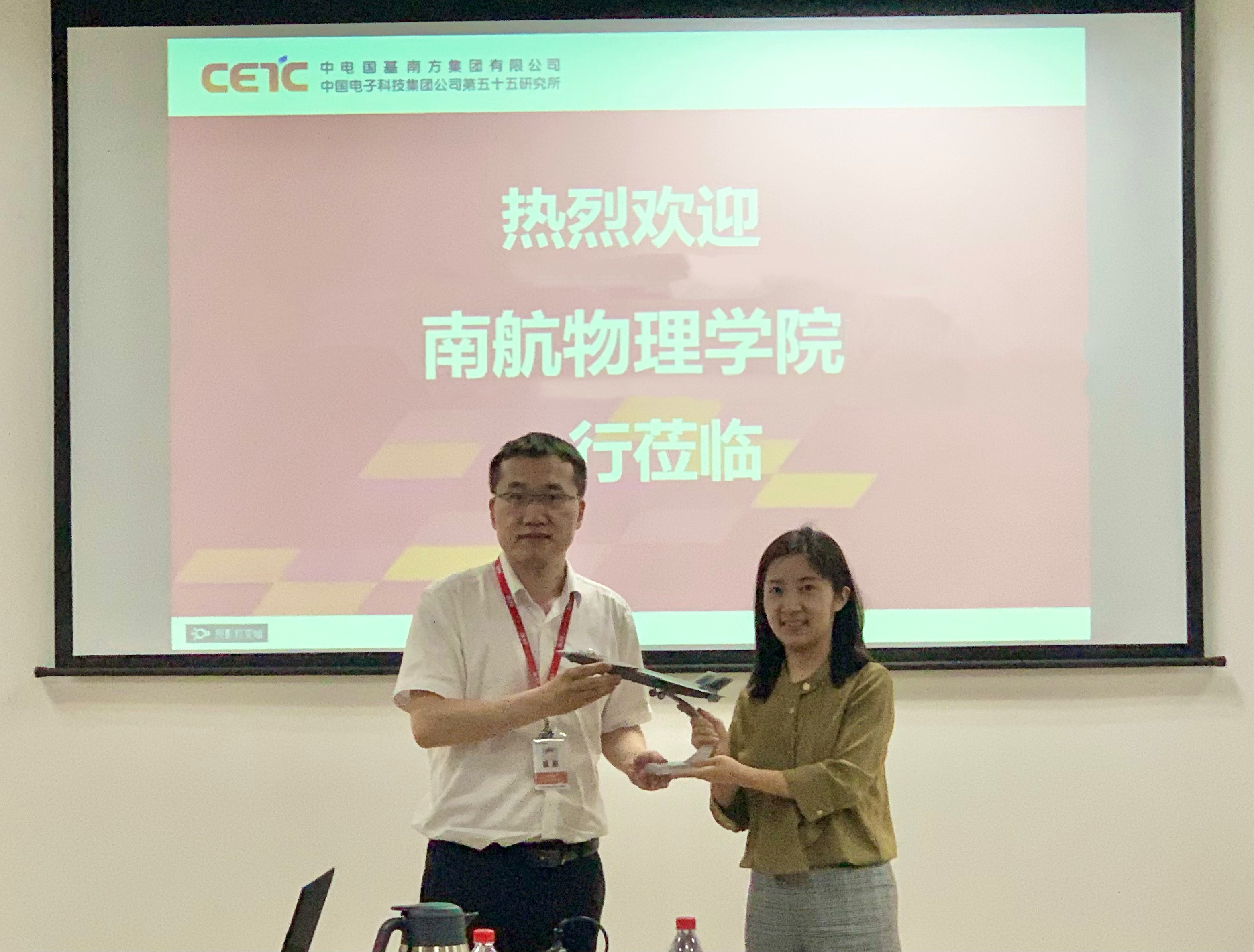 谢俊领代表中国电科五十五所对欧珊一行到访表示热烈欢迎。他简要介绍了中电五十五所的发展历程、亚洲色吧、人才引进、校企合作等方面的基本情况,重点讲解了与物理学科匹配度较高的研发部在技术产品、就业招聘等方面的情况和需求。