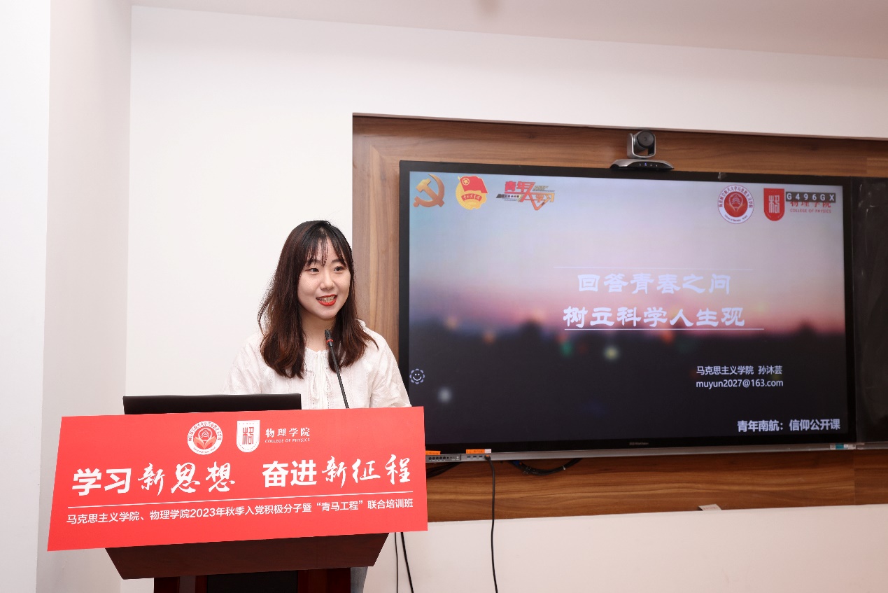 最后,孙沐芸勉励在场同学,作为当代大学生,要学习马克思主义理论尤其是习近平新时代中国特色社会主义思想,以科学理论为指导,应用于实践中,在人生经历中不断感悟人生,树立科学的人生观和价值观,成为堪当民族复兴大任的新时代好青年。
