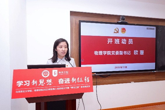 欧珊做开班动员。她介绍了本期培训班的学员构成、课程安排并针对如何开展学习对学员们提出了三点希望:一是要肩负使命学,努力成为有理想、敢担当、能吃苦、肯奋斗的时代好青年;二是要带着问题学,认认真真读原著、学原文、悟原理,做到学、思、用贯通,知、信、行统一;三是要紧跟时代学,强化活到老、学到老的思想,不断加强理论武装,始终跟上时代进步的潮流。