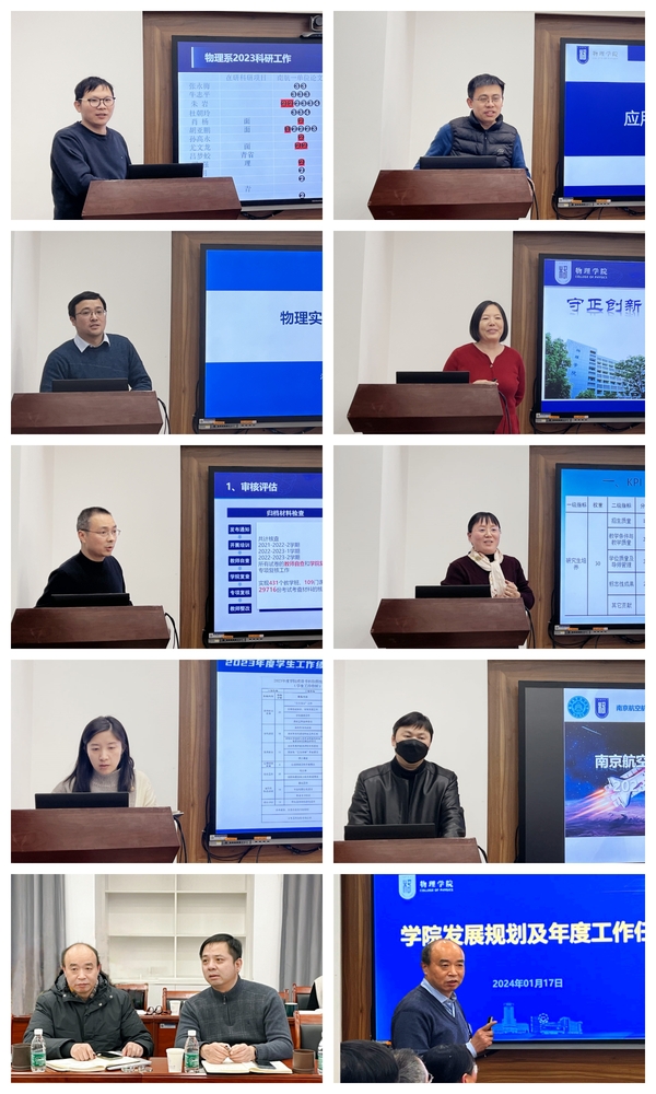 各系(中心)主任围绕师资建设、科学研究、人才培养等方面介绍了系(中心)在2023年取得的进展和成果,重点阐述了2024年的工作计划。副院长徐飞、阎志军、阚彩侠,副书记欧珊分别对照学院考核的重点,介绍了2024年学院在科学研究、国际合作交流、本科和研究生教育教学、学生工作等方面的发展思路。与会人员就新形势下学院如何提升高层次人才引培力度、加强基础前沿高水平研究、推进学科交叉融合发展、提高拔尖创新人才培养质量等议题进行了充分研讨,凝聚共识,提出了建设性建议,明晰了学院新一年的目标任务与发展路径。