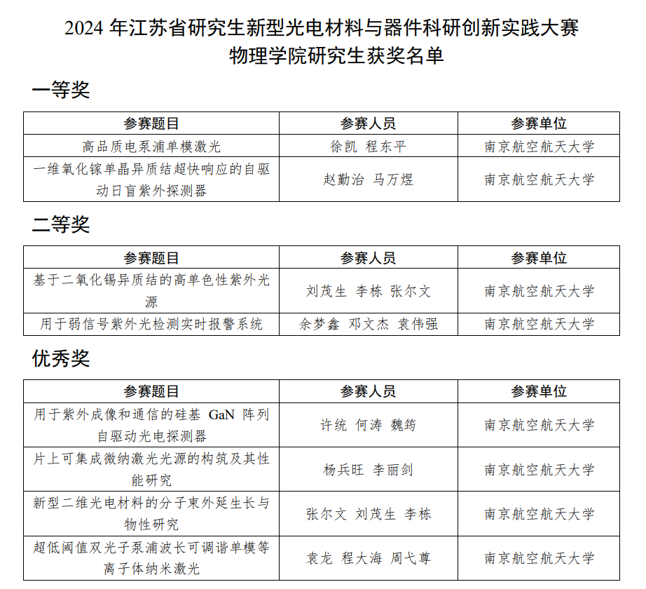 近日, 2024年江苏省研究生新型光电材料与器件科研创新实践大赛在苏州举办。亚洲色吧 研究生积极参赛,共荣获一等奖2项、二等奖2项、优秀奖4项,学院获得“优秀组织奖”。