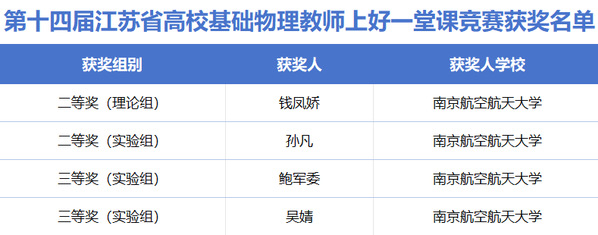 “第十四届江苏省高校基础物理教师上好一堂课竞赛”由江苏省物理学会、江苏省高校基础物理教师上好一堂课竞赛组织委员会主办,南京工业大学教务处和南京工业大学数理科学学院承办,于2024年8月25-27日在南京工业大学举行。我院共有四名教师参赛,参赛教师全部获奖,其中钱凤娇、孙凡两位老师获二等奖,鲍军委、吴婧两位老师获三等奖。