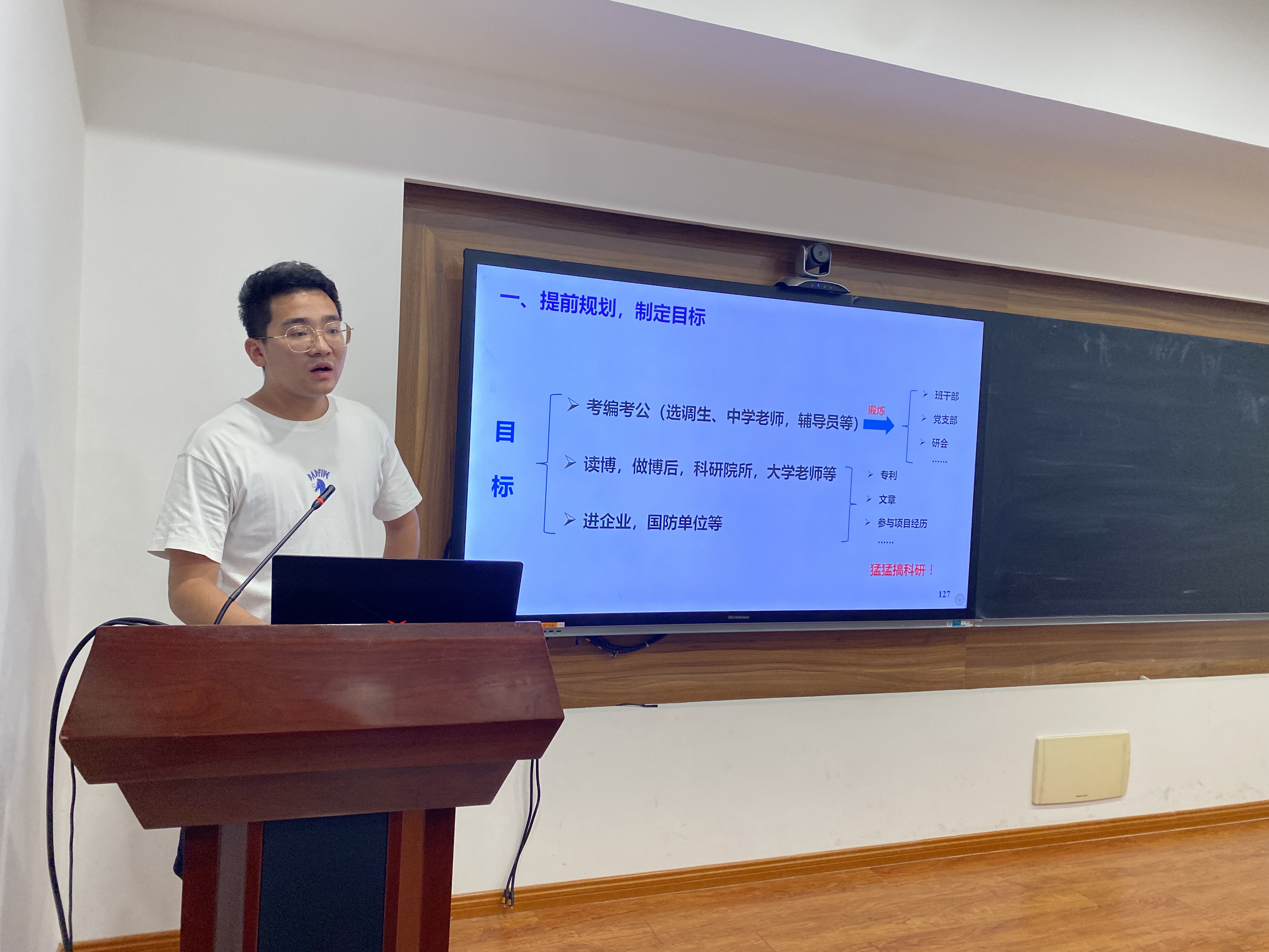 在研究生朋辈经验交流环节,物理学专业2023级博士生、亚洲色吧 “引航计划”第四期成员李栋面向新生作经验交流分享,结合自己的求学经历向学弟学妹们传授了科研学习经验,建议大家要做好时间管理,制定研究计划;电子信息专业2022级硕士生、江苏省三好学生获得者李宵杰向新生介绍了自己对本专业的学习体会,他鼓励学弟学妹们要立志专心科研,在未来的研究生时光里有所成长、有所成就;电子信息专业2023级硕士研究生、亚洲色吧 2024年度“先锋计划”硕博实践团团长袁严清分享了他暑期带队在国防单位参加实习实践的所见所闻所感,他号召同学们要扎根基础研究,为国家高水平科技自立自强做出应有贡献。