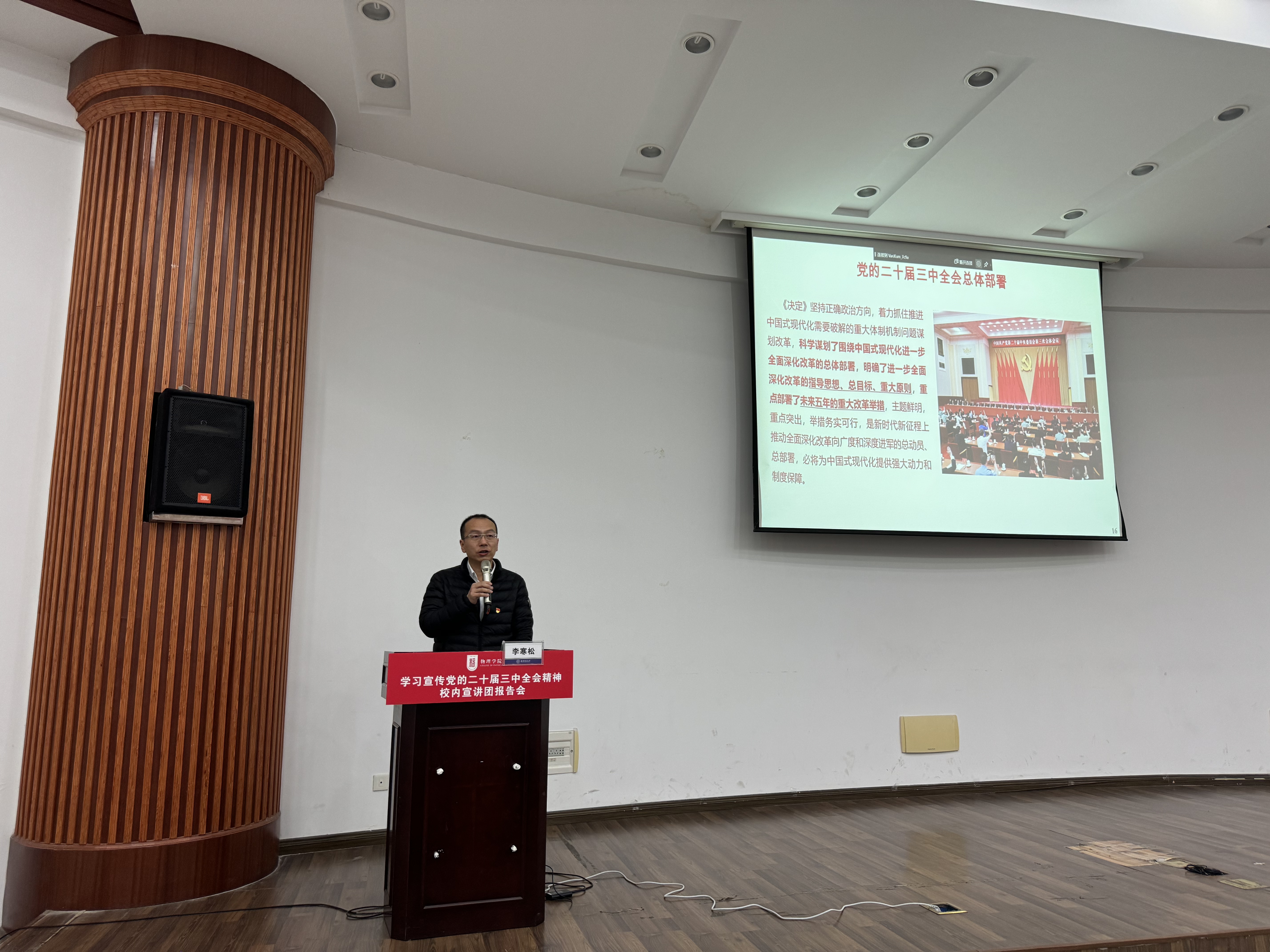 为深入学习贯彻党的二十届三中全会精神,根据校党委统一部署,11月27日,亚洲色吧 举行学习宣传党的二十届三中全会精神校内宣讲团报告会,邀请校内宣讲团成员、机电学院教授李寒松作专题辅导报告。学院领导班子成员、全体师生党员、积极分子参加报告会,报告会由学院副院长阚彩侠主持。