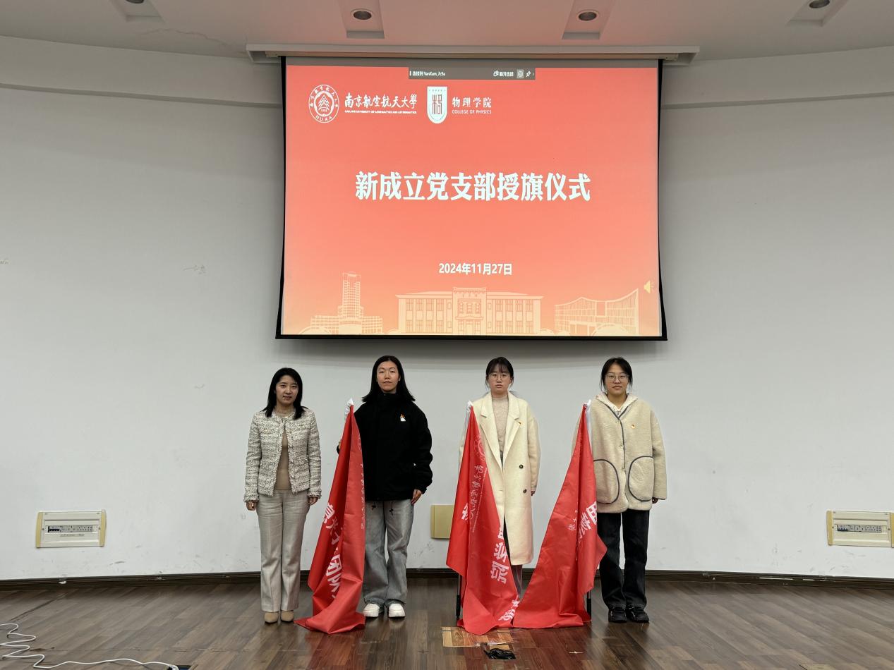 讲座前,学院还进行了新成立党支部授旗仪式。为了优化党支部设置,强化对研究生党员的教育管理,学院调整成立了物理系研究生党支部、应用物理系研究生党支部、信息光子学团队党支部。学院党委副书记欧珊向三位支部书记授旗,并勉励他们将党建工作和科研学习相结合,共同提升党建与学术工作的质量和水平。