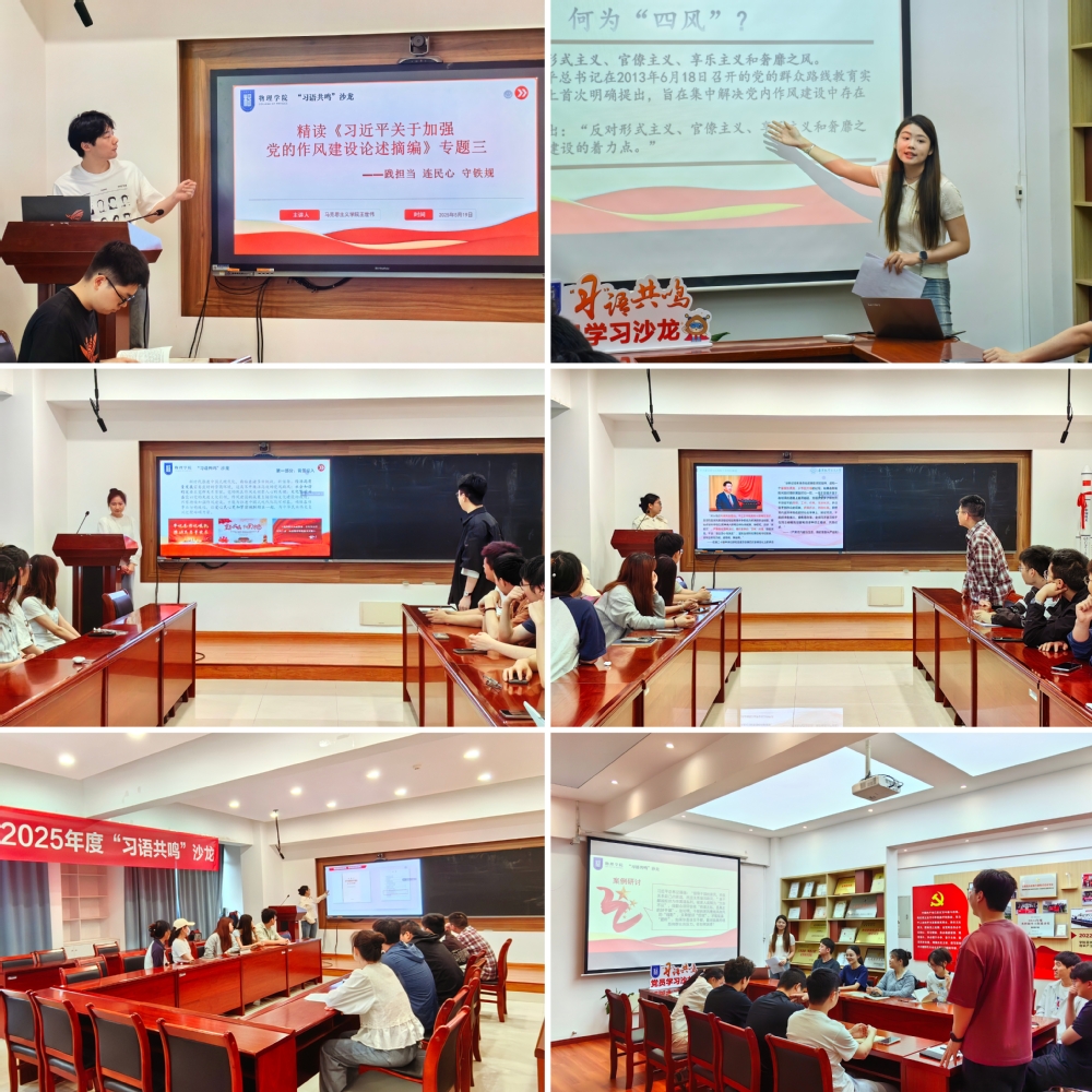 为深入贯彻中央八项规定精神学习教育,筑牢思想根基,引导学生党员准确把握党的作风建设的核心要义,将作风建设理论转化为实际行动,亚洲色吧 各学生党支部轮值邀请马克思主义学院星火燎原宣讲团共同研学《习近平关于加强党的作风建设论述摘编》(以下简称《摘编》),共组织开展5期“习语共鸣”系列读书沙龙。
