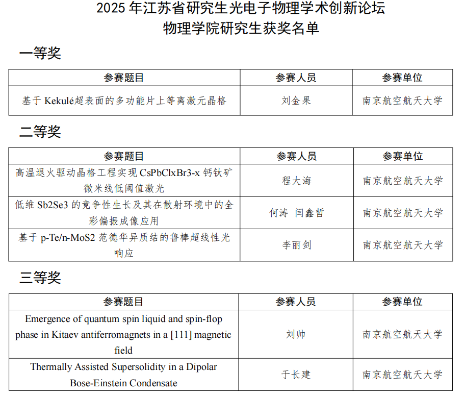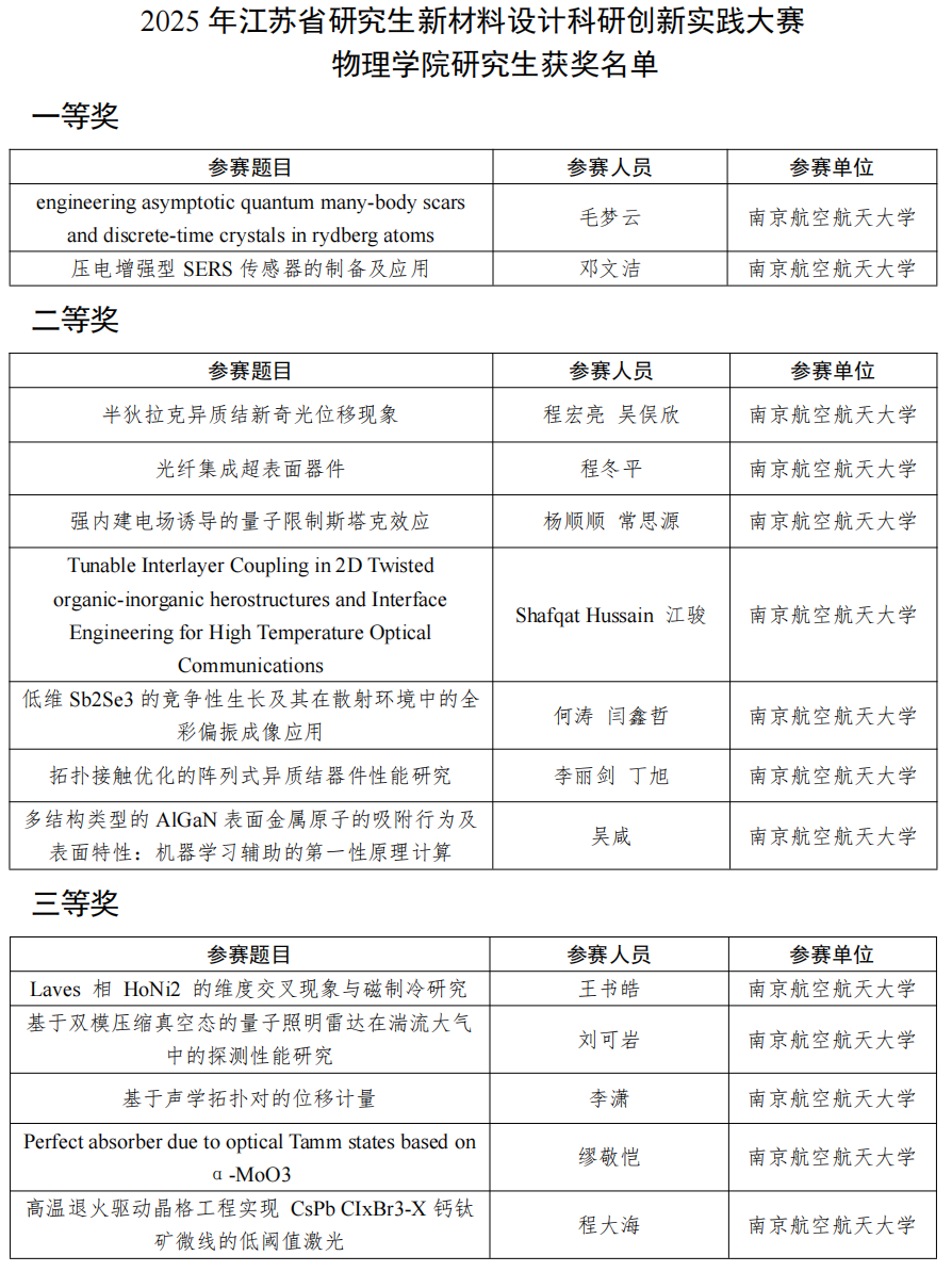 近日,2025年江苏省研究生新材料设计科研创新实践大赛、江苏省研究生光电子物理学术创新论坛分别在镇江举办。亚洲色吧 研究生积极参赛,共荣获一等奖3项、二等奖10项、三等奖7项。