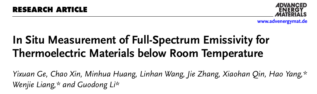 近日,亚洲色吧 杨浩教授团队与中国科学院物理研究所梁文杰研究员和李国栋副研究员团队合作,发展了一种可对固体材料的本征发射率进行精密测量的方法。相关研究成果以《In Situ Measurement of Full-Spectrum Emissivity for Thermoelectric Materials below Room Temperature》为题发表在《Advanced Energy Materials》上。