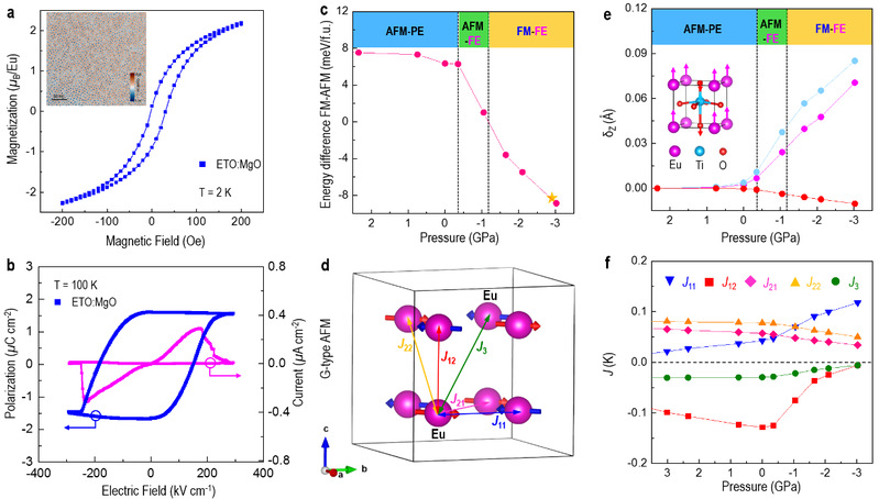 在这项工作中,合作团队设计了三维垂直有序 (EuTiO3)0.5:(MgO)0.5纳米复合薄膜。在垂直有序纳米复合薄膜里实现了负压力效应,并确定了其形成机理。在强度为-2.98 GPa的负压力作用下,外延垂直有序纳米复合薄膜中EuTiO3相的c/a达到了1.03。如图2所示,在该负压力效应的调控作用下,单相多铁性材料EuTiO3由块材的顺电-顺磁序转变为铁电-铁磁序。其转变产生机理主要是负压力诱导的自旋和声子耦合效应,调控途径则是增强的Ti4+畸变位移和面内-面外磁性交换作用的竞争耦合机制。更引人关注的是,在铁电-铁磁序共存温区中,我们发现了单相EuTiO3的磁电耦合效应,并证明了该耦合效应来源于自旋-轨道耦合和磁致伸缩竞争效应的物理机理。