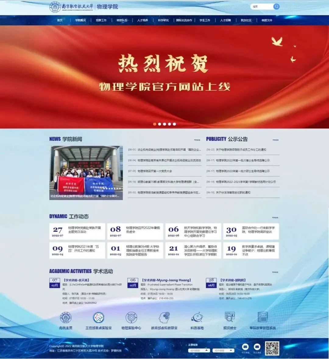 新学院,新气象。在前期充分调研和广泛征求意见的基础上,学院于6月下旬启动了官方网站建设工作,经过几轮设计修改、编程测试及内容更新,物理学院官方网站即日起正式运行。物理学院官方网站主色调采用南航蓝,融入物理与空天特色。网站包含学院概况、党群工作、师资队伍、人才培养、科学研究、国际交流合作、学生工作、人才招聘、院友社区和制度文件等十个栏目,全面细致地展示了物理学院全新的风貌。