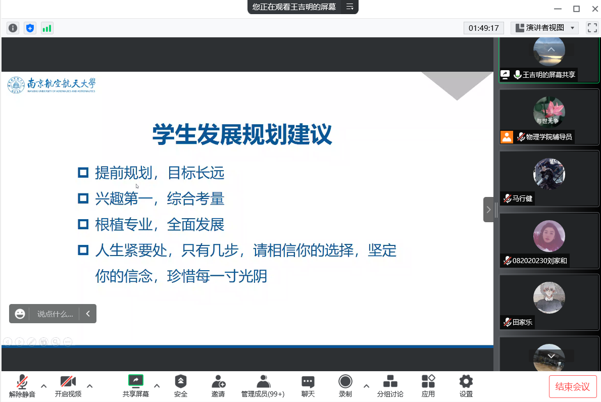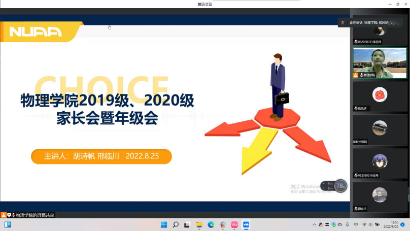 新学期开学前夕,为加强家校合作,有针对性地解答各阶段学生及家长关心关切问题,共促学生成长成才,物理学院召开了2019级、2020级线上家长会暨年级会。物理系主任尤文龙,应用物理系主任王吉明,班主任肖杨、张卫纯、徐峰、钱凤娇参会,并与学生、家长交流。辅导员胡诗帆和邢临川主讲。