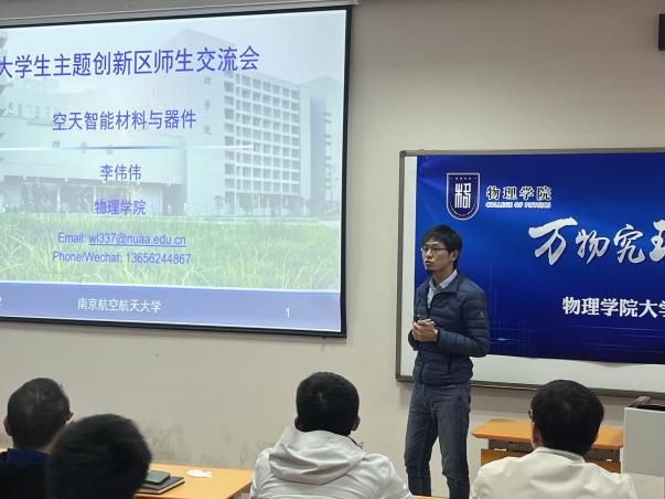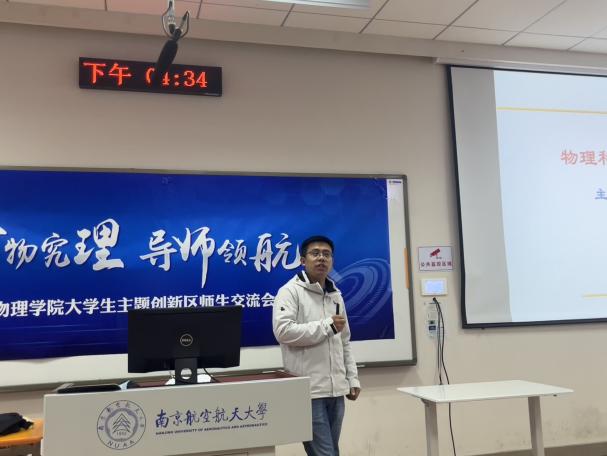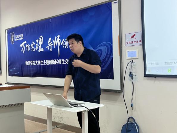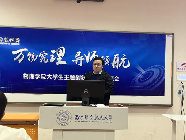 卢俊峰介绍了物理学院大学生主题创新区的建设情况、创新区对本科生创新实践能力培养的支撑,鼓励学生积极了解、投身科研科创,提升素质能力。九大主题创新区包括“物理科学与应用”、“紫外日盲探测”、“空天智能材料与器件”、“物理实验演示与探究”等。每个创新区老师代表分别介绍了创新区的基本情况、主要研究方向以及所在领域的前沿发展、实验室设备条件、人才培养模式以及可供本科生选择的科创项目。李伟伟老师介绍了跟航空学院合作研究的空天智能材料与器件课题;姜明明老师介绍了紫外探测器在军事与日常生活中的应用;王吉明老师介绍了创新区承担的物理学术竞赛与物理实验竞赛的指导;董大兴老师围绕各种物理感知元件介绍了传感器技术与应用;潘琦老师介绍了创新区正在研究开发的多种物理演示实验;伏洋洋老师介绍了创新区自主搭建的“声学结构功能材料实验室”;吕梦蛟老师介绍了超原子核第一性原理的计算研究;罗强老师介绍了量子物理领域的前沿研究。同学们了解到了大学学习的广泛性,更深刻的理解了自主学习的重要性,对今后的学习科研有了更加清晰的规划,增强了基础学科学习的信心。