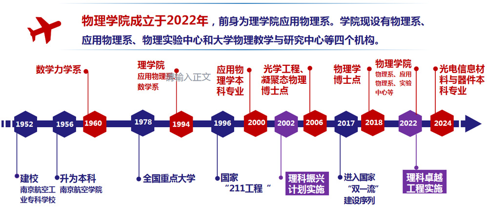 物理学院前身是1960年3月成立的数学力学系。学院现设4个系/中心:物理系、应用物理系、物理实验中心和大学物理教学与研究中心。学院自2022年成立以来,坚持“四个面向”,在强化学科前沿研究的基础上,立足于国防与学校“三航”特色,注重理工融合和多学科交叉融合创新。通过学校实施的“理科振兴”“理科卓越”计划,逐步形成凝聚态物理、力学、材料等交叉研究队伍。依托“空天信息材料与物理”工信部重点实验室平台,以空天环境新材料和高新技术需求为牵引,瞄准物理及其相关交叉学科前沿开展研究,取得了系列原创性科研成果。主动对接国家战略需求,突出“以本为本”,聚焦本科教育教学质量全面提升,从公共课程教学和应用物理学专业人才培养两个方面,推动人才培养范式从“以教为中心”向“以学为中心”转变。