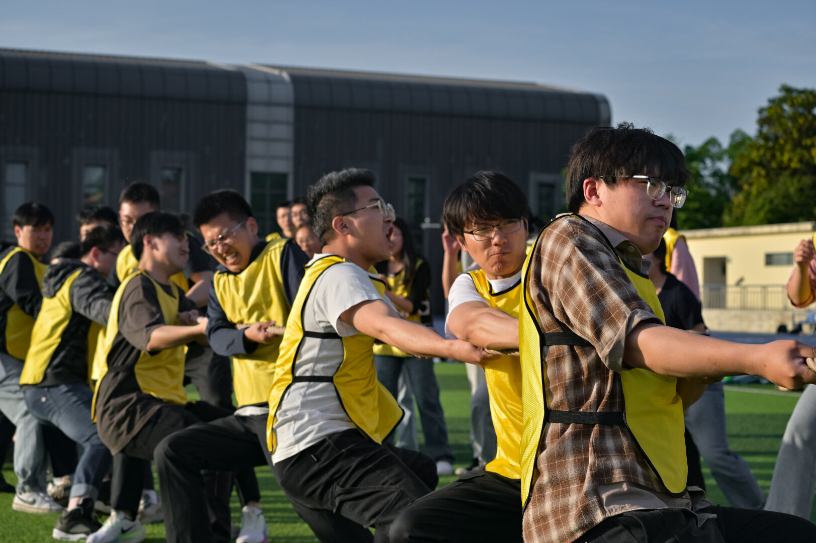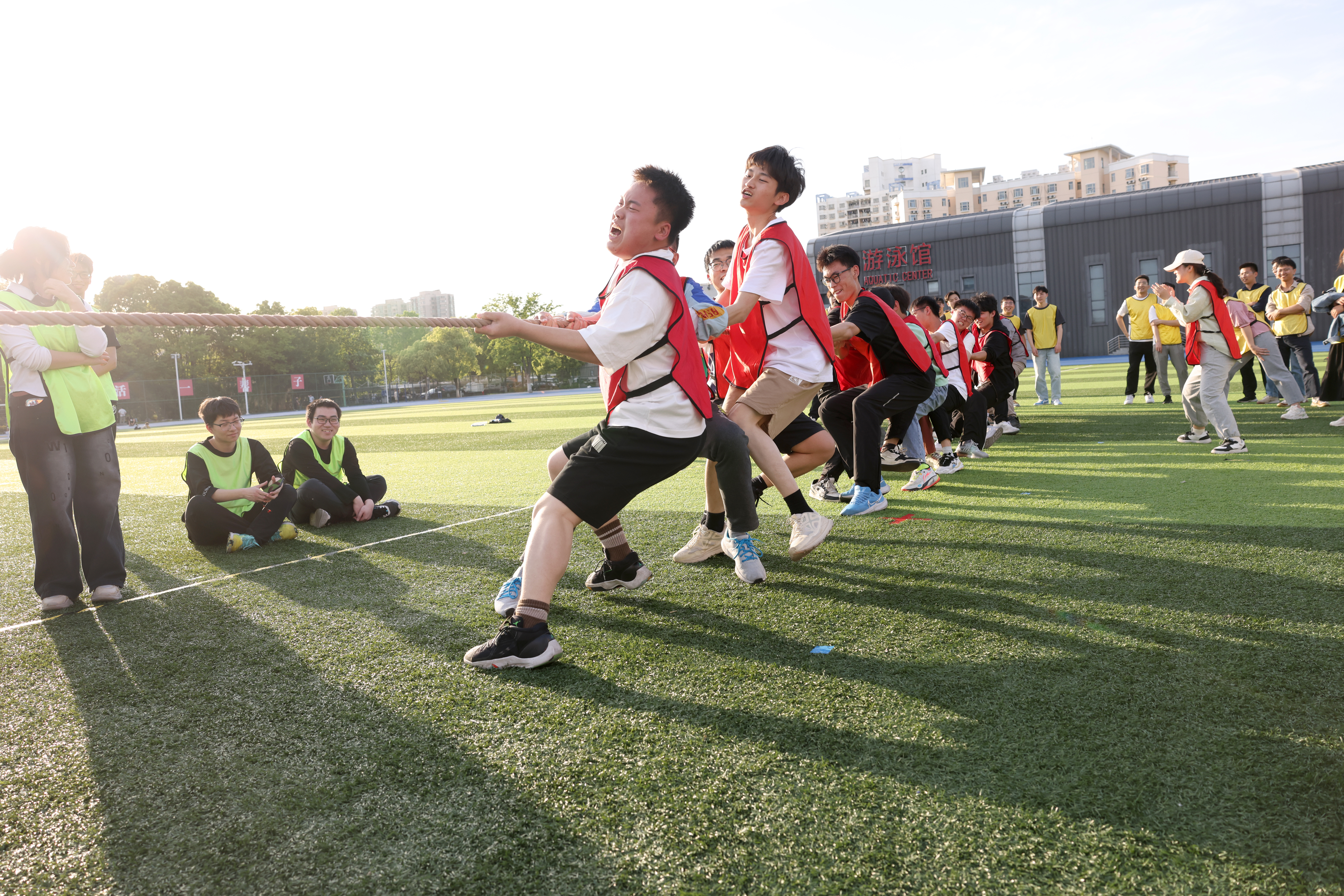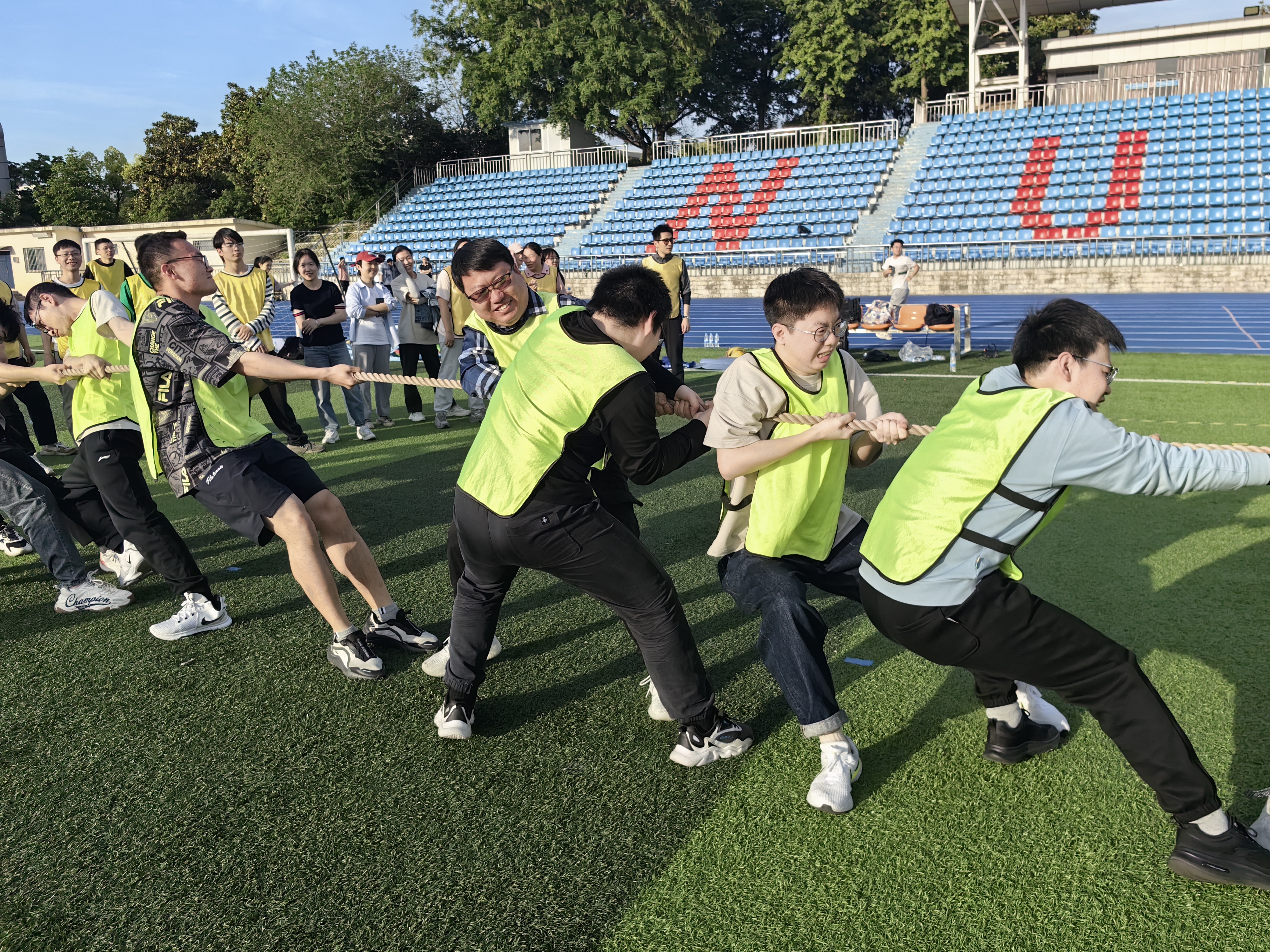 “团结一心 力拔山河”项目将全场的气氛推向了高潮,场上助威加油的呐喊声震耳欲聋。拔河最是要求大家“劲往一处使”,粗长的绳子不仅承载着双方队员的力量,更体现了场上场下老师与同学们的信任与配合。在短促齐整的口令中,师生们坚定目光,全力以赴,竭尽所能为团队的荣耀而战。