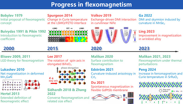 近日,物理学院龚琦花博士,基于其近几年从事挠曲磁的研究经验,对挠曲磁效应的发展与挑战进行了详细总结与论述。从挠曲效应出发,详细阐述了挠曲磁和应变梯度的定义,介绍了不同尺度下挠曲磁性的理论模型,并展示了通过挠曲磁效应操控磁性能的模拟和实验进展。讨论了关于不同结果之间差异的主要矛盾和挑战,阐明了现有理论的局限性,最后对未来挠曲磁研究的前景提出了见解。