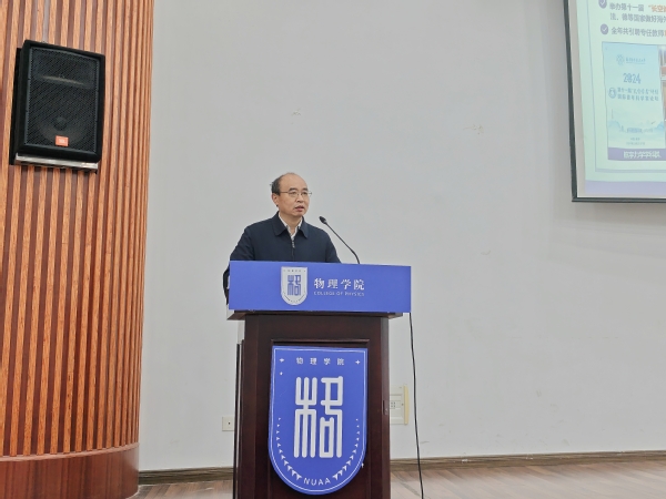 最后,陈修文书记传达了干部教师大会校党委书记甄良讲话精神,强调了为实现2035年学校进入世界一流大学行列的宏伟发展目标,全校教师需聚焦“八个认清”,凝心聚力,奋发作为,奋力推动航空航天民航特色鲜明世界一流大学建设。他指出,学院要在学校的整体战略部署下,着力推动以下重点工作:一是锚定教学强院突破攻坚。在教师教学竞赛、一流课程建设、教材建设等方面持续发力,尽快由教学大院转变为教学强院;二是聚力科研特色创新突围。围绕国家重大需求和学校“三航特色”,促进学院在特色领域中重点突破,取得标志性成果,加速理工交叉融合;三是强化人才引擎战略支撑。大力推进高层次人才引进与学院师资队伍建设,启动学术伯乐计划,动员全院教师积极推荐海内外优秀学者。学院教师要充分认识学院当下面临的机遇与挑战,准确把握学院重点发展目标与任务,凝聚共识、形成合力,共同书写物理学院高质量内涵式发展的新篇章。